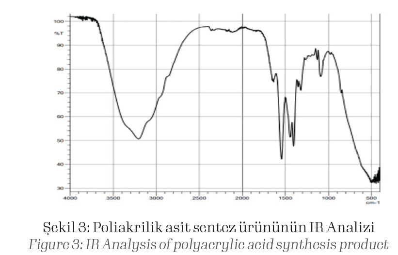 Poliakrilik asidin kimyasal yapı aydınlatılması FTIR spektroskopisi ile (Şekil 3) incelenmiştir. Elde edilen FT-IR spektrumlarında, karboksilik asit tuzlarına özgü olan 1651 cm−1 dalga numarasındaki karakteristik emilim bantları, C-OH deformasyon titreşimlerine karşılık gelirken, 1559 cm−1 ve 1324 cm−1 dalga numaralarındaki iki bant (karboksilik anyonların simetrik gerilme titreşimleri -COO−) ortaya çıkar.