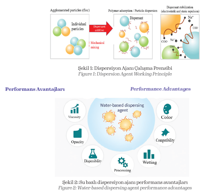 Dispersiyon ajanı, pigmentlerin ve dolgu maddelerinin flokülasyonunu önlemek için kullanılan bir boya hammaddesi olup boya ortamındaki katı parçacıkların süspansiyonunu destekleyerek stabilize eder. Dispersiyon ajanının seçimi; dispersiyonun öğütme süresi, viskozite, renk tonu gücü, örtücülük, parlaklık ve stabilizasyon özelliklerinin kalitesini büyük ölçüde etkileyecektir. Dispersantlar; pigmentler, dolgu maddeleri veya katkı maddeleri gibi katı parçacıklar arasındaki çekimi azaltarak işlev görür. Bu, katı parçacıkların kümelenmesini veya çökmesini önler.