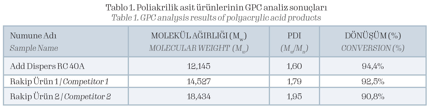 Jel Geçirgenlik Kromatografi yöntemi ile molekül ağırlığı belirlenmektedir. Çalışmalarımız sonucunda Tablo 1’de sentezlediğimiz dispersiyon ajanlarının molekül ağırlıkları tayin edilmiş olup dispersiyon ajanlarının boya içerisindeki performanslarının değerlendirilmesinde yol gösterici olmuştur. Böylelikle karakterizasyon analizleri doğrultusunda 5,000 ve 15,000 g/mol aralığına sahip dispersiyon ajanları özellikle yüksek PVC oranlarına sahip boya formülasyonunda kullanıldıklarında stabilizasyon sonrası viskozite değişimini olumlu yönde etkilemektedir. Yüksek performansa sahip fonksiyonel polimerik dispersant ile döngüsel ekonomiye katkı sağlaması hedeflenmektedir.
