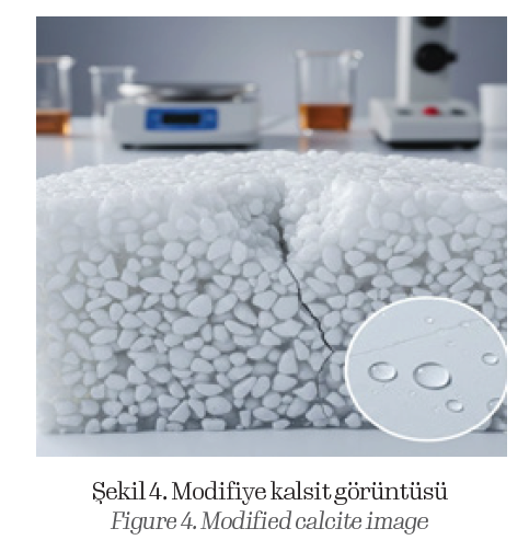 Kalsit (CaCO₃), polimer kompozitlerde yaygın olarak kullanılan inorganik bir dolgu maddesidir. Geleneksel olarak maliyet düşürücü bir katkı olarak değerlendirilmesine rağmen, uygun parçacık boyutu ve yüzey modifikasyonu ile kullanıldığında mekanik dayanım, rijitlik ve termal kararlılık üzerinde önemli iyileştirmeler sağlayabilmektedir [7]. Özellikle stearik asit gibi hidrofobik ajanlarla yüzeyi modifiye edilmiş kalsit, polimer matris ile dolgu arasındaki ara yüzey bağını güçlendirmekte ve kompozitin suya karşı direncini artırmaktadır [8].
