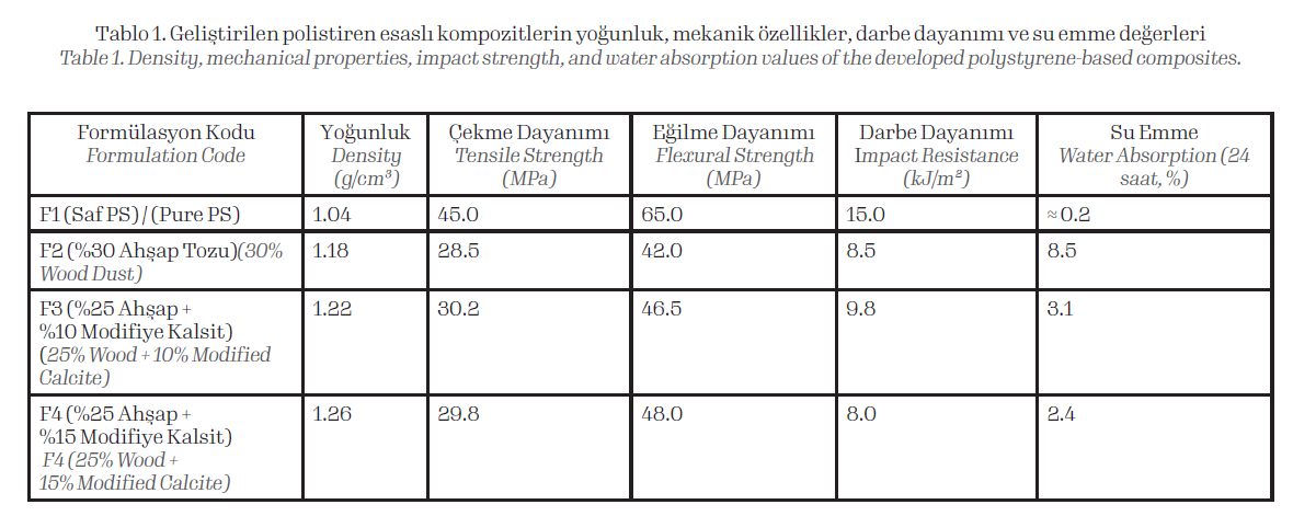 Saf polistiren (F1) numunesi 1.04 g/cm³ yoğunluk sergilerken, ahşap tozu ve kalsit ilavesi ile yoğunluk değerlerinde artış gözlemlenmiştir. %30 ahşap tozu içeren F2 formülasyonu 1.18 g/cm³ yoğunluğa ulaşmıştır. Modifiye kalsit içeren F3 ve F4 formülasyonlarında yoğunluk sırasıyla 1.22 ve 1.26 g/cm³ olarak ölçülmüştür [9].