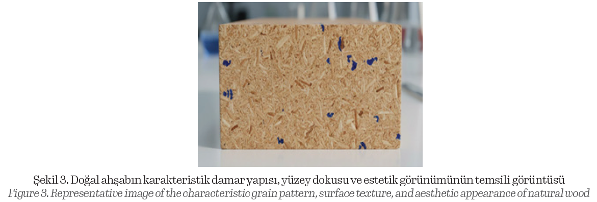Kalıptan çıkan düz yüzeyli paneller, kontrollü bir ısı kaynağı (pürmüz) kullanılarak lokal yüzey eritme işlemine tabi tutulmuştur. Bu işlem, ahşabın doğal damar ve gözenek yapısını taklit eden bir yüzey morfolojisi oluşturmuştur. Tekstürasyon sonrası yüzeyler zımparalanmış ve şeffaf poliüretan vernik uygulanmıştır.