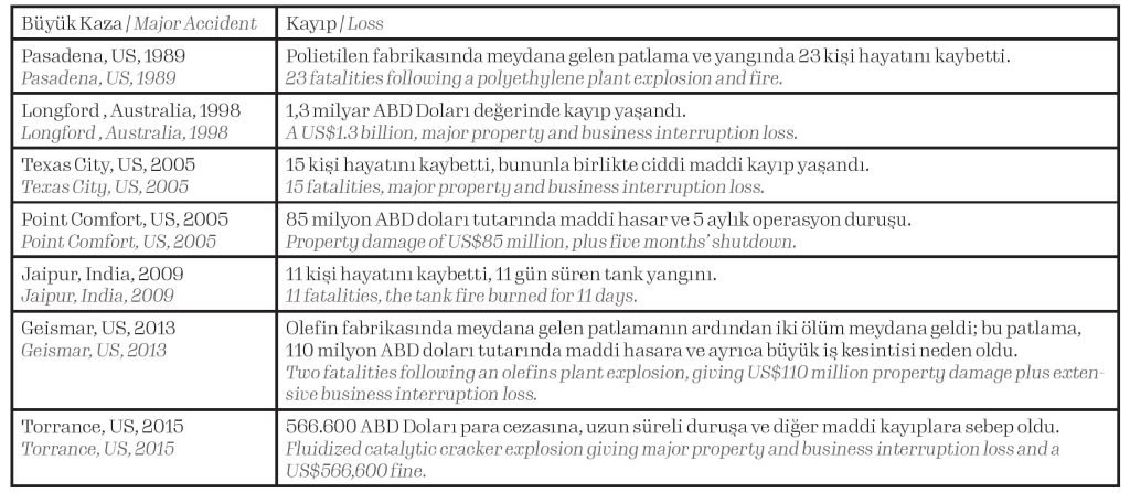 Etkin bir proses tehlike analizinin yapılmadığı ve proses tehlike analizleri sistematiğinin olmaması dolayısıyla yaşandığı belirlenen kazalar için tablodaki örnekler verilebilir [1].