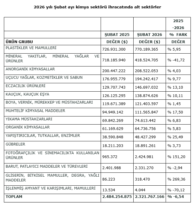 Şubat ayında kimyevi maddeler ve mamulleri ürün gruplarında plastikler ve mamulleri 770 milyon 189 bin dolarla kimya ihracatında ilk sırada yer aldı. İkinci sırada 418 milyon 524 bin dolarlık ihracatla mineral yakıtlar ve ürünler ihracatı yer alırken, anorganik kimyasallar ihracatı 208 milyon 522 bin dolarla üçüncü sırada yer aldı. ‘Anorganik kimyasallar’ı takiben ilk onda yer alan diğer sektörler ise; ‘uçucu yağlar, kozmetikler ve sabun’, ‘eczacılık ürünleri’, ‘kauçuk, kauçuk eşya’, ‘boya, vernik, mürekkep ve müstahzarları’, ‘muhtelif kimyasal maddeler’, ‘yıkama müstahzarları’ ve ‘organik kimyasallar’ oldu.