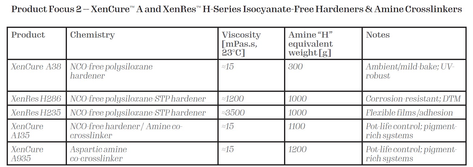 Product Focus 2 — XenCure™ A and XenRes™ H‑Series Isocyanate‑Free Hardeners & Amine Crosslinkers