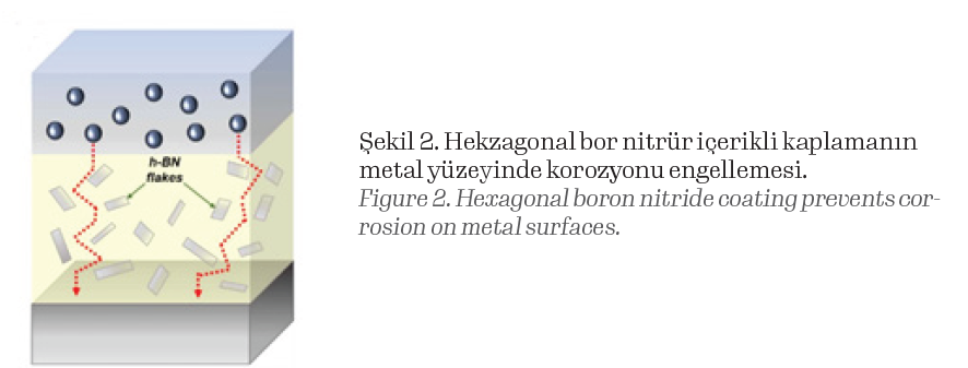 Bunun yanında anti korozyon özelliği yüksek olan hekzagonal bor nitrür ile korozyon dirençli kaplama geliştirilme çalışmaları devam etmektedir. 2 boyutlu yapıya sahip olan düzlemsel hekzagonal bor nitrür metal yüzeyinde örtücü özellik sağlayarak korozyonu oluşturan ortam ve iyonları metal yüzeyinden uzak tutarak korozyonun önüne geçmektedir.