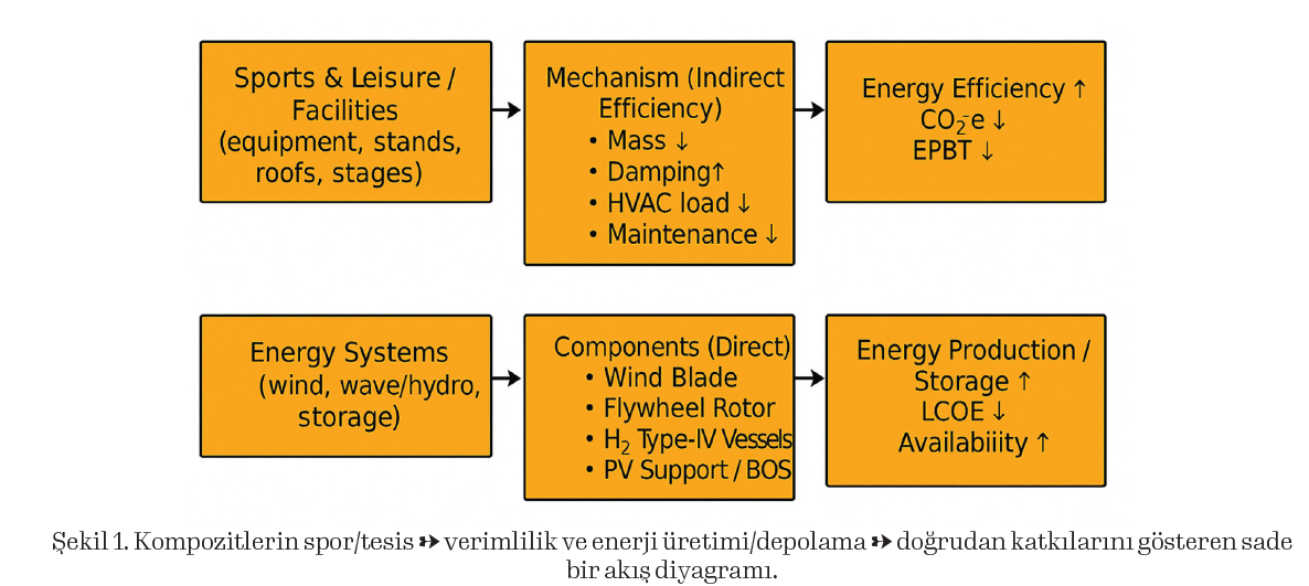 Bu derleme; (i) spor ekipmanları ve tesislerinde enerji verimliliği kazanımlarını, (ii) enerji üretimi/depolamayla kesişen uygulamaları, (iii) yaşam döngüsü değerlendirmesi (EPBT, EoL) ve (iv) tasarım–KPI çerçevesini derler. Temsili vakalar ve sayısal sezgilerle, kompozitlerin gömülü enerji maliyetine rağmen kullanım evresi tasarrufları ile enerji geri ödeme sürelerinin (EPBT) çoğu senaryoda kısa kaldığı gösterilir. Son olarak, standartlar (ISO/IEC) ve Ar-Ge gündemi ışığında hafifletme, hibrit lay-up ve out-of-autoclave süreçlere yönelik yol haritası sunulur.