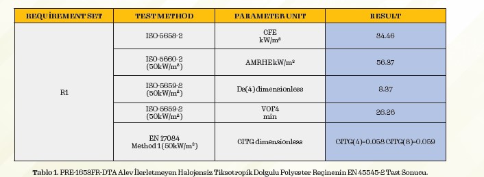 Akredite bir kuruluş tarafından yapılan testler neticesinde PRE-1653FR-DTA reçinesin ve bu reçineden yapılan jelkotun EN 45545-2 standartına göre sonuçları gösterilmektedir.