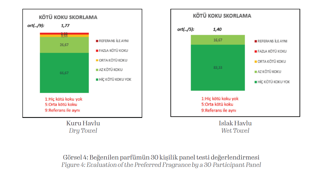 C firmasının panel testinde en başarılı bulunan parfümü ile kuru ve ıslak havludaki kötü koku önleme kapasitesi 30 kişilik daha büyük bir panel çalışması ile de ölçülmüştür.