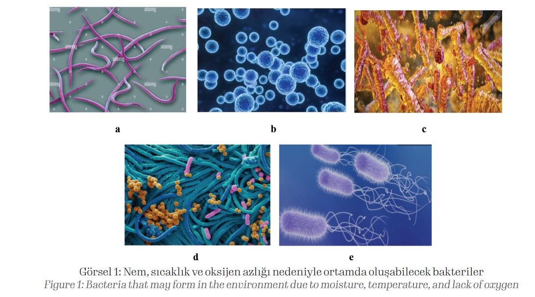 Nem, sıcaklık ve oksijen azlığı nedeniyle bakteri yoğunluğu artmaktadır. Ortamda oluşabilecek bakteriler şunlardır: Moraxella osloensis (a) , Staphylococcus spp (b), Corynebacterium spp.(c), Micrococcus (d), Pseudomonas spp (e).